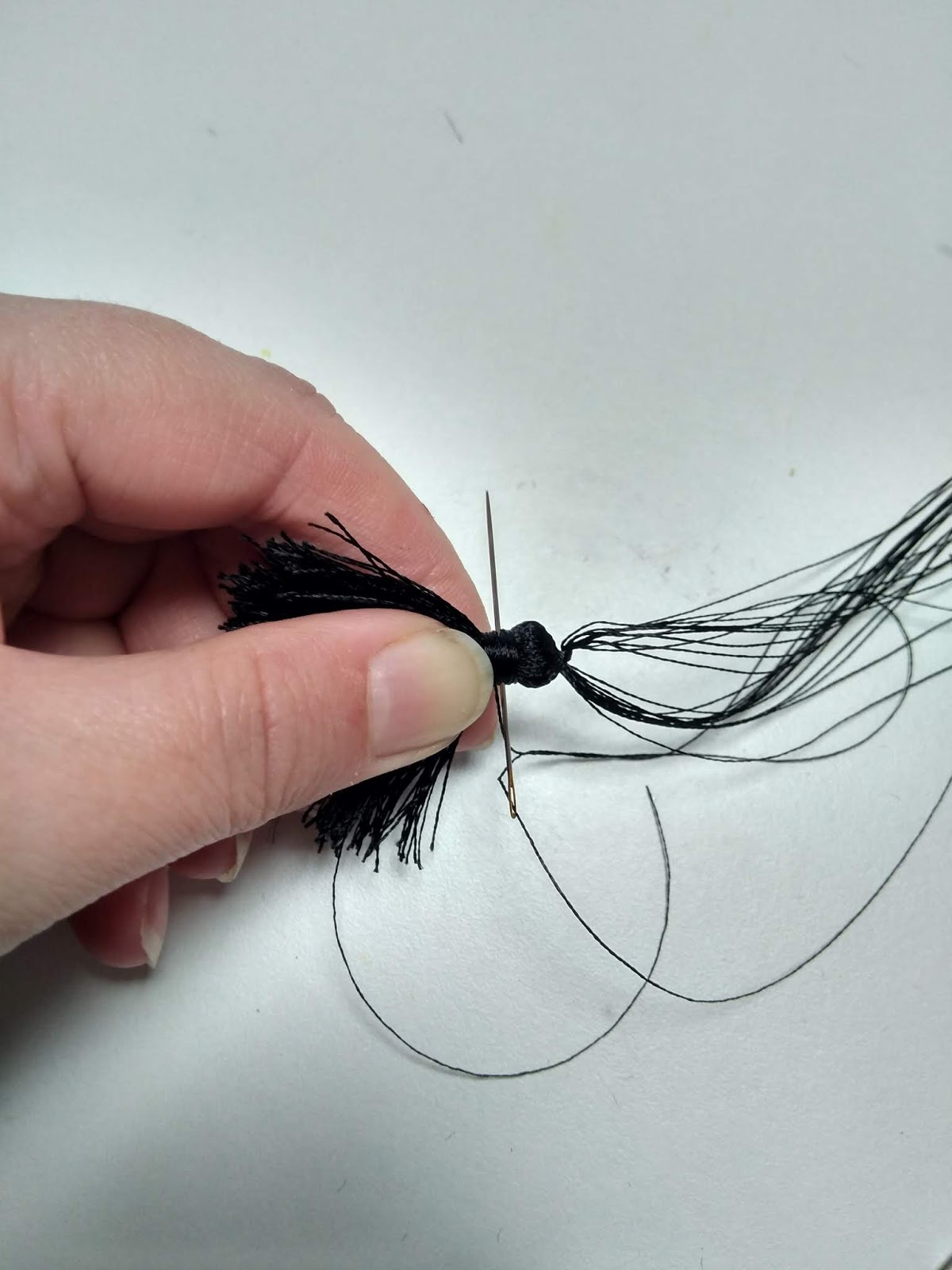 Lo enhebramos y pasamos la aguja de lado a lado de la borla ( por la parte que hemos enrollado) para fijarlo y por último hacia abajo, para camuflar el hilo perdido.